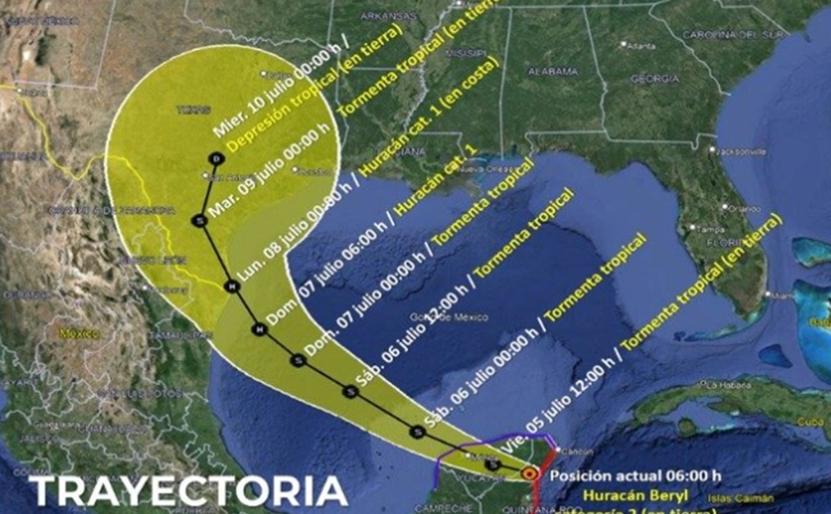 Las bandas nubosas de Beryl ocasionarán lluvias puntuales torrenciales en Campeche, Yucatán y Quintana Roo; lluvias puntuales intensas en Chiapas y Tabasco, así como oleaje de 6 a 8 metros de altura y la posible formación de trombas marinas.
